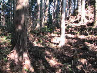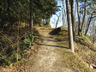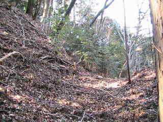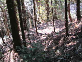これが、城郭遺構なのか、後世の林道なのか(それにしては狭い。ただの山道?)判断に苦しむ。