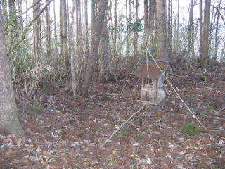 | 本郭に建つ社。 | 本郭の南側には窪地Vがある。 土塁の向こうが堀切@である。 |
