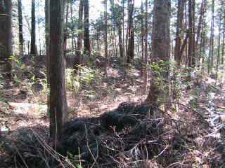 | 東側にある堀2。これが一番明瞭であった。 | 堀2と5のピーク間の鞍部。幅5mほどで平坦。 | 5のピーク。ここは見張り台であろう。 ここにも狼煙台のような穴があった。 |