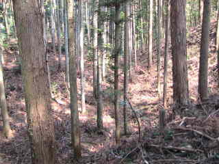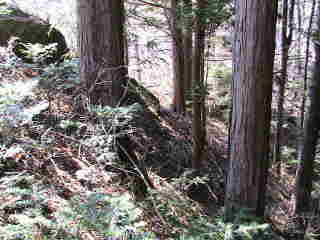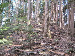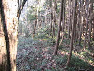 この付近の斜面には帯曲輪のような平坦地があるが、これは植林に伴うもののように見える。