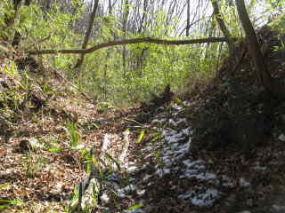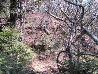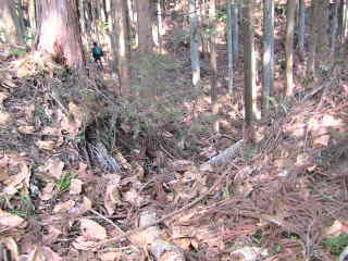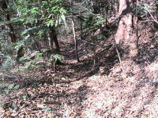 | @背後の堀切から東に下る竪堀 | A堀切から西に下る竪堀を下から見る。本来は豪快な薬研堀だろう。 |