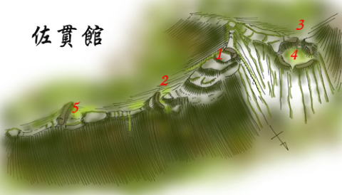 中央部が主郭部、東のピークに物見のような曲輪、そして主郭部背後の西側に主郭を守る曲輪郡が展開し、西端の堀切で終わる。 この館の非常に変わった遺構として直径40〜50mほどのクレーター状の曲輪4,5が東西の端にあることである。 東端に曲輪は東端部に土塁状の高まりがあり、南側が開いているのでクレーター状に見えるだけかもしれないが、西端の遺構は土塁と山が周囲を1周しており、途中、2箇所の切れ目がある不思議な空間である。井戸のようにも思える。 まず、東側の部分であるが、先端部に物見のようなピークがあり、そこから100mほど、高度で20m登ると例のクレーター状遺構の曲輪5に至る。 その西側は長さ30m、幅15mの平坦地がある。 この西側は一端下りとなる。鞍部に堀切のようなものがあるが、堀切としてはかなり埋没している。 |