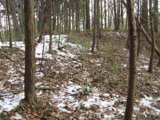 館跡北下のWの部分。 下には雪が積もっている帯曲輪がある。 |