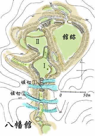 この館、特徴は北端部、標高150m地点に70m×50mほどもある平坦地があることである。 また、南側から高さ2mほどの土塁が張り出し、その南側に1mほど高く曲輪がある。 |
