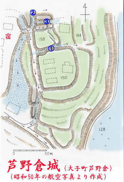 なお、昭和50年頃の航空写真を見たら、主郭の南東下の谷津部に畑が・・・。こんな山中に。