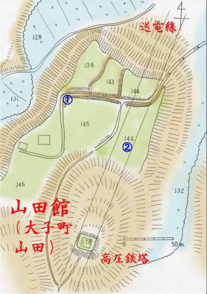 地元の人も皆「あそこの鉄塔が建っている辺りが城だったと聞いている。そこは「立下」(タテシタ、「館下」のなまりだろう。)といって、字は「ひらざむらい」と言うんだ。」 と言うので、これらの伝承、地名から館があった場所として有力である。 しかし、鉄塔のある場所には何にもない。 周囲の斜面の勾配も緩やかである。 鉄塔工事で改変されている可能性もある。 ただ、南側が高さ4mほどの鋭い切岸になっている。 ここがかろうじて物見台であったことを感じさせる部分である。 その先、南に続く尾根筋に堀切があってもよさそうであるが、「ない」。 さらに尾根伝いに南に進んでみても同じである。 どうも先端部のピークを物見台程度として使っただけで、その北下の平坦地が館主体部であったようである。 城主等は分からない。 ところで「ひらざむらい」って何だ?「平侍」と書くのだろうか? 「平社員」なら分かるが「平侍」とは・・足軽か?もしかして、これは「平氏」の落人を指しているのではないだろうか? なお、大子吉成文書に佐竹氏の秋田移封に同行せず、この地に帰農した佐竹氏家臣として山田地区では相沢彦九郎の名が確認できる。 この相沢氏が館主であった可能性もある。 |