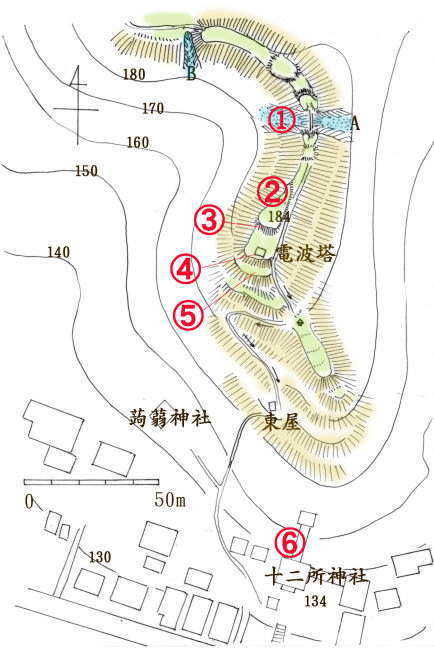標高184.2m最高箇所A付近にはアンテナ塔Cがあるが、その設置工事で改変を受けているようである。 ここは曲輪ABCであったと思われる。 その南側に帯曲輪Dが3つ確認できる。さらに十二所神社Eにかけて段々が続くが、藪が酷く十分に確認できない。 これらも曲輪の可能性がある。 標高134mの十二所神社の地も曲輪だったかもしれない。 しかし、最高箇所から北に延びる尾根を行っても先に挙げた堀切@1本のみしかない。ただし、幅は約10mあり規模は大きく、斜面は竪堀となっている。 その堀切には土橋がある。 なお、その土橋、アンテナ塔工事のため付けられた感じである。 |
