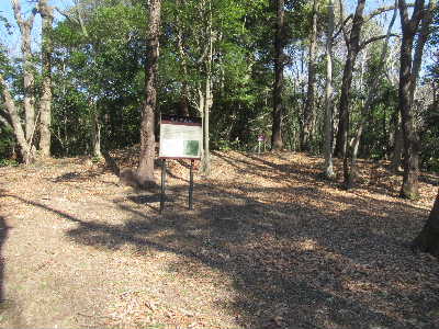 | @本郭の土壇、解説板に以前の縄張図が・・・ | A 本郭南下の二郭、本郭との間の切岸は緩やか。 | B 本郭(左)下の三郭、切岸は約5mと鋭い。 |
