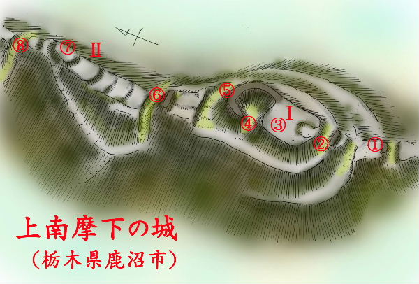城へは県道15号沿いに南摩招魂社に登る参道があり、ここを上がる。 すでに南摩招魂社の境内も城域であり、居館があったのであろう。 ハイキングコースが造られており、遊歩道を辿れば夏場でも難なく上の城まで行くことができる。 南摩招魂社境内は30m四方程度である。その裏手から登りとなる。 ここから上がっていると既に2,3段の平坦地(4)が現れる。 (注 ( )付き数字は左の鳥瞰図に記入した番号に対応します。) 西側に横堀のようなものがあったが、後で確認したが、間違いなく城郭遺構であった。 この横堀は西側斜面をとおり、下の城背後の堀切までつながる。 神社から高度で20mほど上が下の城の主郭部(1)である。 主郭の南側は6mの切岸になっており下に土塁を持つ曲輪がある。 この曲輪は主郭の西側を回って、主郭に合流しているのでこれが本来の登城路であったと思われる。 その下にも曲輪3があり、堀切がある。主郭(1)は長さ40m、幅30mほどであり、西側以外を土塁が覆う。 北端と南端の土塁は高く櫓台と思われる。 主郭の北、上の城に続く尾根筋に4本の大きな堀切がある。 特に主郭北の堀切(2)は主郭側からの深さが7mほどある。 |