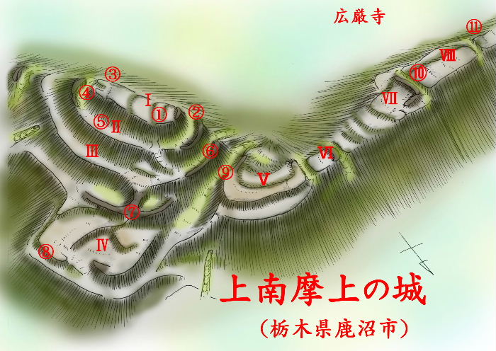 本格的な詰めの城は県道177号線バイパスを渡った西側の北西から延びる尾根を北西側に水平距離で750m、比高で約150m登った上南摩上の城である。