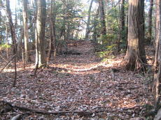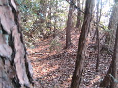 | 下の城主郭1の土塁。 ハイキングコースの道になっている。 「むなつき坂」が笑う。 それほどきつくはないのだが。 |
