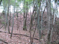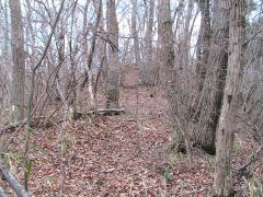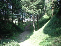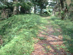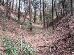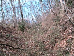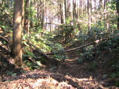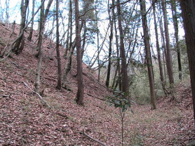 | 二郭を東下の腰曲輪から見る。 | 二郭内部と西側を覆う土塁。 | 二郭西側に横堀。 この先で竪堀になる。 |
