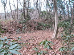 山の先端部が竹林であるのでここを入ればよい。 ただし、竹の子シーズンは泥棒に間違われる可能性があるので避けた方が良いかもしれない。 藪が酷いのは取り付きの部分のみであり、竹林内部はそれほどの藪ではない。 しかし、勾配が急で登るのが大変である。 ちなみに城から下りる時、足を滑らして斜面を滑落するというぶざまな結果となった。 みっともない姿であり、誰も見ていなくてよかった。 斜面の途中に井戸跡のような窪みがある。 5分ほど登り、頂上部に近づくと平坦地が現れる。 二郭東の曲輪群である。二段ほどになっている。 二郭には東側に回り込むと虎口があって郭内に入れる。 二郭東の曲輪群からは5mほど高い場所が二郭である。 それほど大きな曲輪ではなく、40m×30mほどの広さである。 西側と南側に高さ2mほどの土塁が取り巻き、南西端が櫓台のようになっている。 |