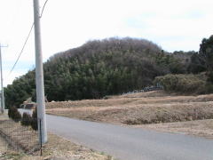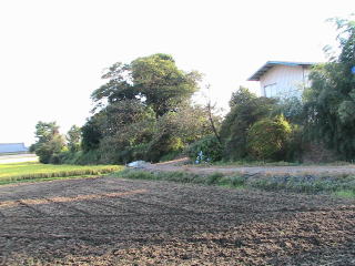 | 城址に建つ標柱、この付近が中城。 | 林の部分が中城の北端、土塁と堀がある。 | 西側から見た中城方面、手前が外城。 |