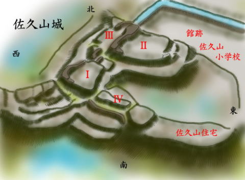 郭Wの東側には堀切があり、直径40mの郭を経て、佐久山住宅の地となる。