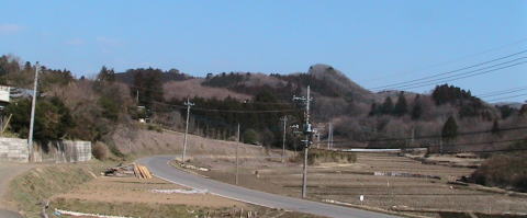 麓の国道294号線沿いから見ると、山の上に電波塔が見るが、その北の山が城という。城への入口を捜すがよく分からない。 |