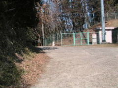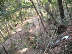 | 配水場前から見た主郭部虎口 | 主郭部前の切通しは堀切C | 南端にある堀Dは竪堀となって下る。 | 主郭部の虎口を入ると郭5、土塁が覆う。 |