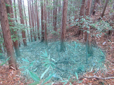 なお、この帯曲輪、南斜面ということもあり、日当たりがよく、凄まじい篠竹地獄であり、歩くのに苦労する。