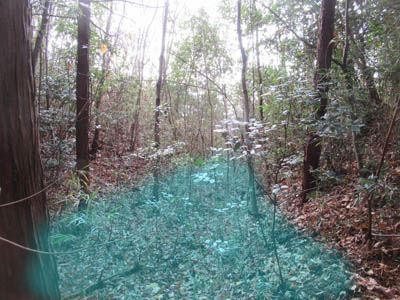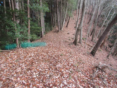 | EU郭の頂上部、平坦であるが、自然の山である。 | FU郭(右)とV郭を隔てる堀。右側に土塁がある。 | GV郭南側を巡る帯曲輪、低い土塁があるので横堀か? |
