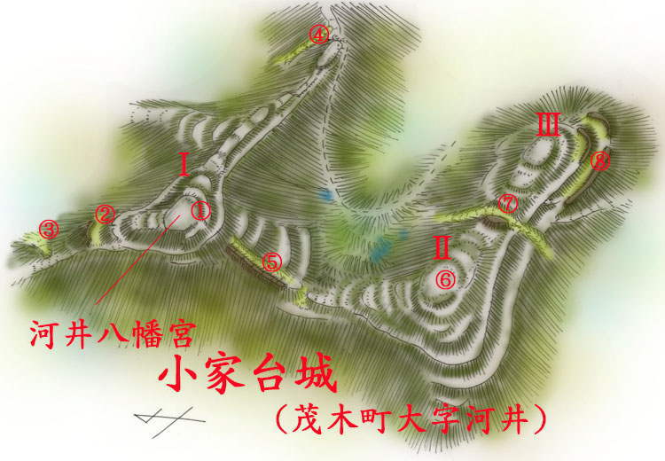 河井の標高276mの山にある河井八幡宮の地は従来から小家台城として知られている。