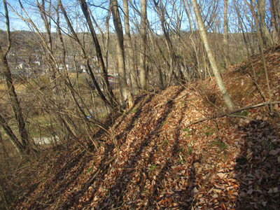 | C北斜面を下る竪土塁と竪堀 | D北斜面を下る竪堀から主郭部を見上げる。 | E西から城に登る尾根は岩だらけである。 |